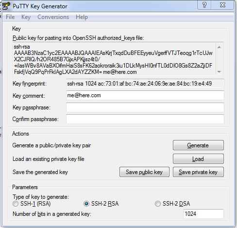 Generate the new keys using PuTTYgen. This is a key generator that comes with the PuTTY SSH client. (If you don’t have the full suite of PuTTY tools installed, you can get them from http://www.chiark.greenend.org.uk/~sgtatham/putty/download.html .) To generate the keys, Launch PuTTYgen. At the bottom of the window, choose “SSH-2 RSA” for the key type, and enter “2048” for the number of bits, then click the “Generate” button. After you click “Generate”, it will show you a progress bar and ask you to randomly move your mouse over the blank area of the window. This generates random data used to generate the key. When it’s done, it will show you a window like this: