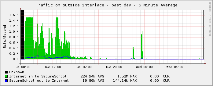 The most common cause of packet loss & latency is simply that there is no more bandwidth available for you to use. For example, if your connection to the Internet is a T1 line, you have a 1.5Mbps. If you have several people streaming video, everyone checking email, and some web browsing going on, it’s easy to max out this connection. This is the easiest cause of loss & latency to troubleshoot. On your SecureSchool appliance, go to “Logs & Reports” -> “Reports & Statistics” -> “Traffic Graphs”, and look at the graph titled “Traffic on outside interface – past day – 5 Minute Average”. The green area represents data coming in from the Internet, and the blue line represents data going out to the Internet. Here’s an example graph: