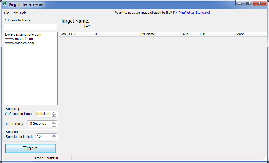 A tool you can run on your workstation that we recommend is called PingPlotter. They have a freeware version available you can try (http://www.pingplotter.com/downloads/pngplt_1.exe), as well as a “Standard” and “Pro” version you can purchase (http://www.pingplotter.com/featurecomp.html). For the purpose of this example, we’ll show the freeware version. Once you install and run the tool, you’ll get a screen like this: