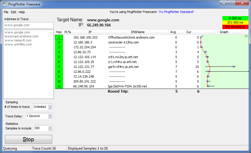 - Address to Trace: www.k12usa.com, the site that’s slow, or an IP address if you think your connection is completely down (12.20.5.53 is www.k12usa.com)