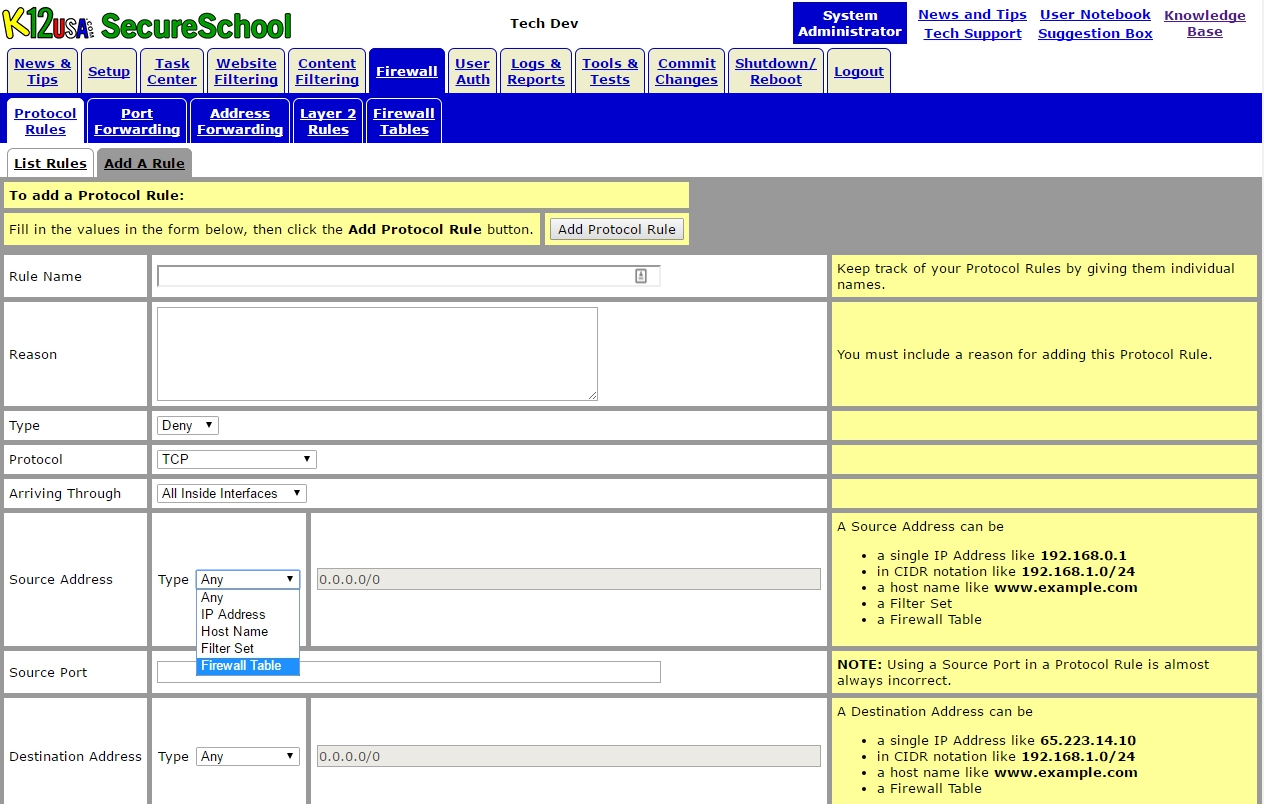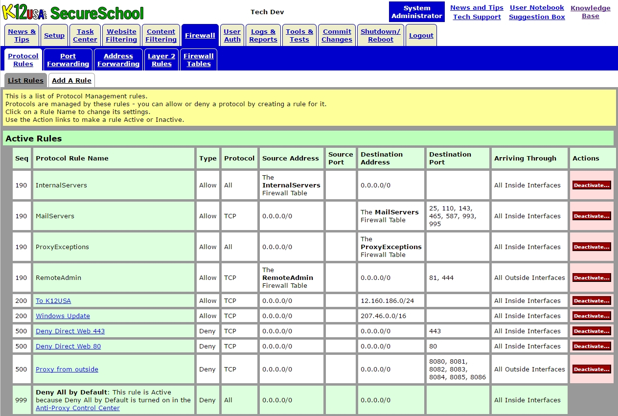 RemoteAdmin – This table is to be used if you want to limit access to the administration interface of the SecureSchool appliance from outside IP address and/or networks. But for this firewall table to be effective you will ned to create a Protocol Rule to Deny access for everyone else. This is based on our recommendation of when trying to prevent access to a service or TCP/IP port, create a deny all rule to prevent anybody and then a rule to creating a rule to explicate allowing access to specific IP address and/or range.