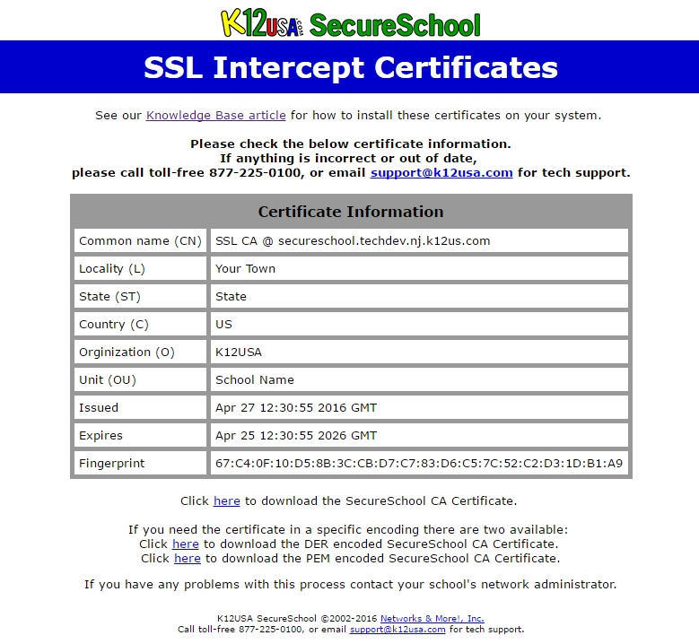 Important – Please check the certificate information. If anything is incorrect (does not have your information) or out of date, please call toll-free 877-225-0100, or email support@k12usa.com for tech support.