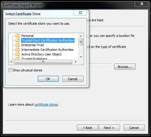 * In some cases you have to check show physical stores, then select “Local Computer” under Trusted Root Certification Authorities.