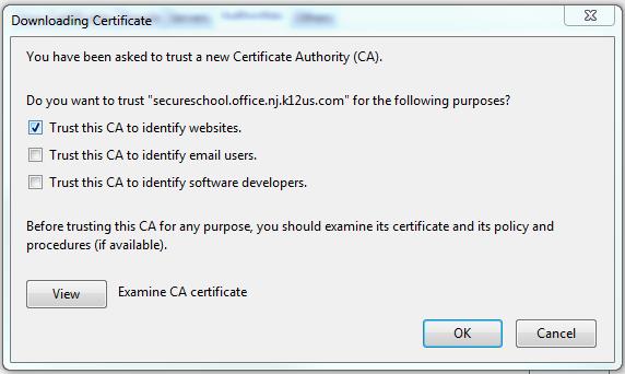 First, you need to download the SecureSchool CA Certificate for your School. In a web browser access the SecureSchool appliance web interface and modify the URL to add “/ssl” after the IP address or DNS name for your SecureSchool appliance (ex. http://192.168.1.1:81/ssl). Click on the link to download the SecureSchool CA Certificate (ss_cacert.pem.crt) and then you will need to install the certificate into your browser on the device you are using.