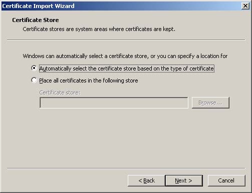 5. Select “Automatically select the certificate store based on the type of certificate“, then click the “Next >” button.