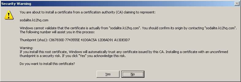 7. A Security Warning box will appear. Click the “Yes” button the install the certificate.