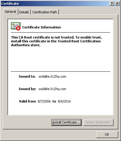 When you use Outlook (or any other POP3 client) to connect to WebMailPRO on Windows 2000 or Windows XP, you will get a warning that the Root CA is not trusted. To solve this, you need to install the K12USA Root CA certificate.