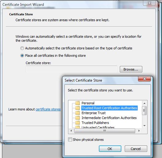 - Click the radio button for “Place all certificates in the following store“, then click the “Browse…” button. This will open the “Select Certificate Store” dialog box. Select the “Trusted Room Certification Authorities” folder, then click “OK“.