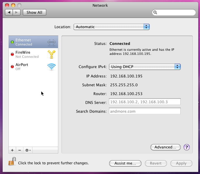 - Go to “System Preferences” -> “Network”. You’ll get a screen similar to the following one: