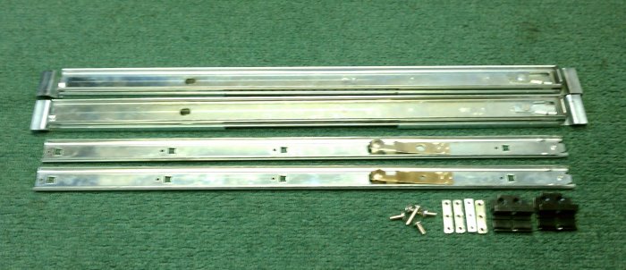 For the Intel SR1425, SR1475 and SR1500 server we use the rail kit pictured below. The kit includes 2 slide rail assemblies and assorted screws. There are installation instructions for this kit in PDF format below.
