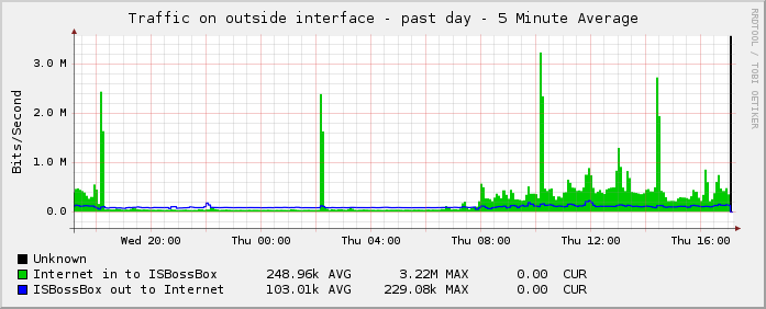 The first place to look is to see how much bandwidth you’re actually using. To see traffic graphs, go to “Logs & Reports” -> “Reports and Statistics” -> “Traffic Graphs”. There are several different graphs here, showing either the outside interface or the inside interface over different time periods. Here’s a sample graph for the outside interface over the last day: